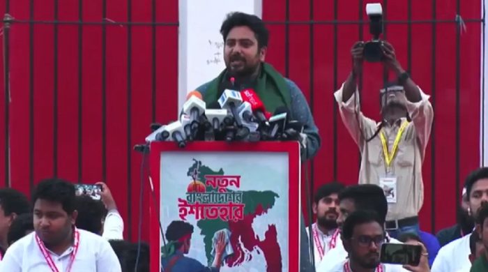 কেন্দ্রীয় শহীদ মিনারে নতুন বাংলাদেশের ইশতেহার ঘোষণা করেছেন জাতীয় নাগরিক পার্টির আহ্বায়ক নাহিদ ইসলাম। রবিবার বিকেলে এনসিপির সমাবেশে ২৪ দফার ইশতেহার ঘোষণা করেন তিনি। নাহিদ ইসলাম বলেন, ‘আমরা আবার শহীদ