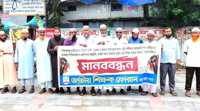 বগুড়ায় জাতীয় শিক্ষক ফোরামের মানববন্ধন অনুষ্ঠিত। আজ (০২আগষ্ট) শনিবার বেলা ১১টায় বগুড়া সাতমাথা চত্বরে বগুড়া জেলা জাতীয় শিক্ষক ফোরাম-এর সভাপতি মাওলানা আলতাফ হোসেনের সভাপতিত্বে এবং সাধারণ সম্পাদক মোঃ মিনারুল ইসলাম