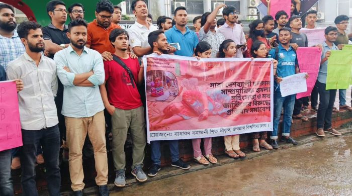 সাম্প্রদায়িক সহিংসতা, ধর্মীয় সংখ্যালঘুদের উপর পৈশাচিক নির্যাতন ও বিচারহীনতার বিরুদ্ধে জগন্নাথ বিশ্ববিদ্যালয়ের শান্ত চত্বরে আয়োজিত হয় এক জোরালো প্রতিবাদ সমাবেশ। “সাধারণ সনাতনী শিক্ষার্থীবৃন্দ”-এর ব্যানারে অনুষ্ঠিত এই কর্মসূচিতে বিভিন্ন বিভাগের সাধারণ
