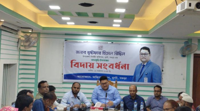 বগুড়ার ধুনটে উপজেলা নির্বাহী অফিসার জনাব খৃষ্টফার হিমেল রিছিলের পদোন্নতিজনিত বিদায় সংবর্ধনা অনুষ্ঠিত হয়েছে। গতকাল ০৯ অক্টোবর বৃহস্পতিবার সকাল ১১ ঘটিকায় উপজেলা অফিসার্স ক্লাবের আয়োজনে ইছামতী হল রুমে এই বিদায়